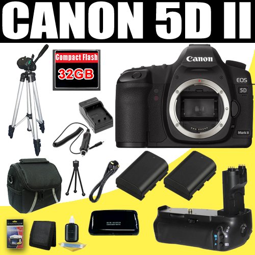 Canon EOS 5D Mark II 21.1MP Full Frame CMOS Digital SLR Camera + Battery Grip + TWO LPE6 Replacement Batteries + 32GB Deluxe Accessory Kit for Sale - Review & Buy at Cheap Price